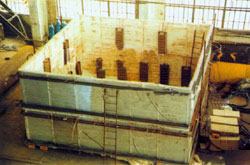 | (二) 拆裝容易能搬遷,維修方便好操作 該種爐子以大地為爐底,地面鋪上硅酸鋁耐火釬維針刺毯或超細玻璃棉被做保溫、耐火絕熱層,爐子的爐墻和爐蓋全部采用專用聯接件及工字鋼將爐體板(見圖3)拼接在一起構成的。拆裝、搬遷都很容易,操作、維修也很方便,工人無需長期培訓,稍加指導即可很快掌握。 |